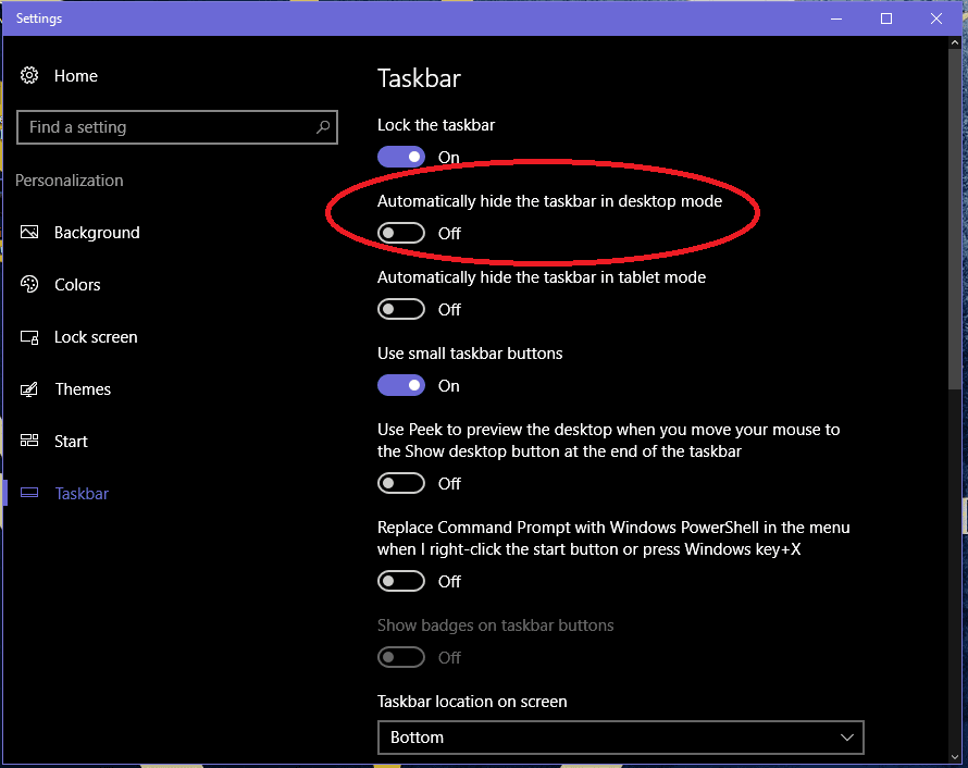 اگر از نوار taskbar  خوشتان نمی آید یا میخواهید صفحه بزرگ تری داشته باشید میتوانید نوار taskbar را پنهان کنید و در مواقع لزوم با بردن نشانگر موس به پایین صفحه دوباره آن را ظاهر کنید.برای این کار بر روی نوار وظیفه کلیک راست کرده و setting  را انتخاب کنید و سپس دکمه ی Automatically hide the taskbar in desktop mode را روشن کنید.