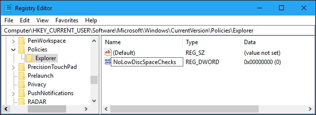 نکته: اگر می خواهید هشدارهای فضای کم دیسک را در آینده فعال کنید، به همین محل در رجیستری بازگردید، روی مقدار NoLowDiscSpaceChecks راست کلیک کرده و آن را Delete کنید تا حذف شود. در نهایت نیز کامپیوتر خود را ریست نمایید.