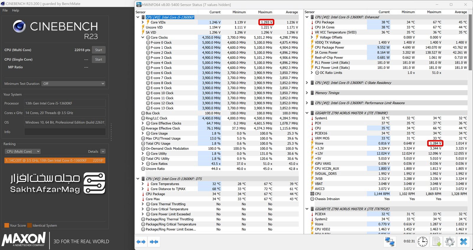 پس از ریستارت سیستم وارد ویندوز شده و یک تست Cinebench R23 میگیریم. همانطور که در تصویر پیداست، مادربرد جلوی پردازنده سر خم نکرده و به هیچ وجه ولتاژی فراتر از عددی که ما تعیین کردیم، به آن تزریق نمیکند.