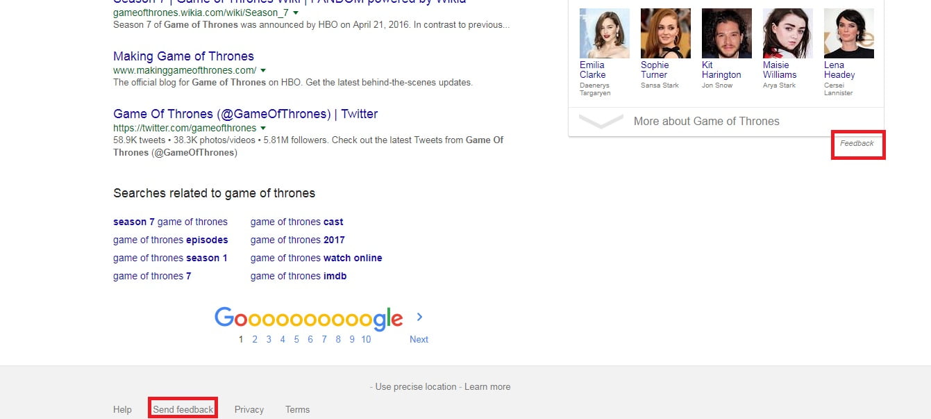 اگر مشکل در بخش One Box نیست در انتهای صفحه جست و جو (پایین تر از قسمتی که شماره صفحات سرچ نوشته شده بر روی send feedback کلیک کنید. در این حالت گوگل یک اسکرین شات از صفحه ای که در آن قرار دارید تهیه کرده و سپس می تواند توضیحات خود درباره نتایج اشتباه در جست و جو را نوشته و برای تیم گوگل ارسال کنید. به گفته گوگل این اطلاعات توسط تیم های انسانی (و نه به صورت کامپیوتری) بررسی می شوند و در صورت صحت گزارش تصحیح خواهند شد. همچنین اگر تعداد کاربرانی که یک مورد را گزارش می کنند زیاد باشد سرعت بررسی نیز افزایش خواهد یافت.