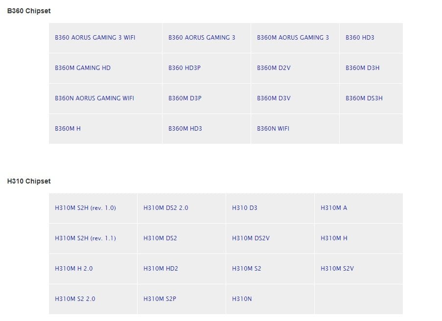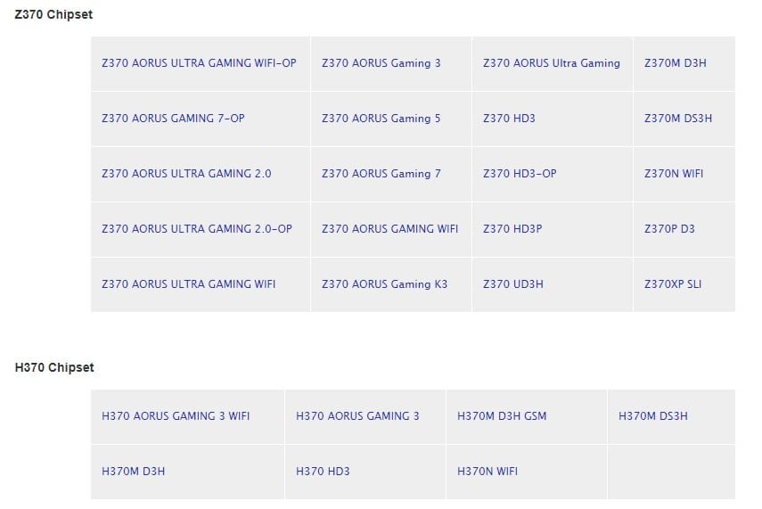 مادربردهای  Z370, H370 و B360 گیگابایت که در لیست های این بروزرسانی قرار گرفته اند، به وسیله بروزرسانی بایوس، از CPUهای نسل نهم Whiskylake پشتیبانی می کنند. تیم مهندسی گیگابایت به روز رسانی BIOS برای مادربردهای Z370، H370، B360، H310 منتشر کرده و جدیدترین به روز رسانی BIOS در حال حاضر در وب سایت رسمی گیگابایت برای کاربران آماده است.
