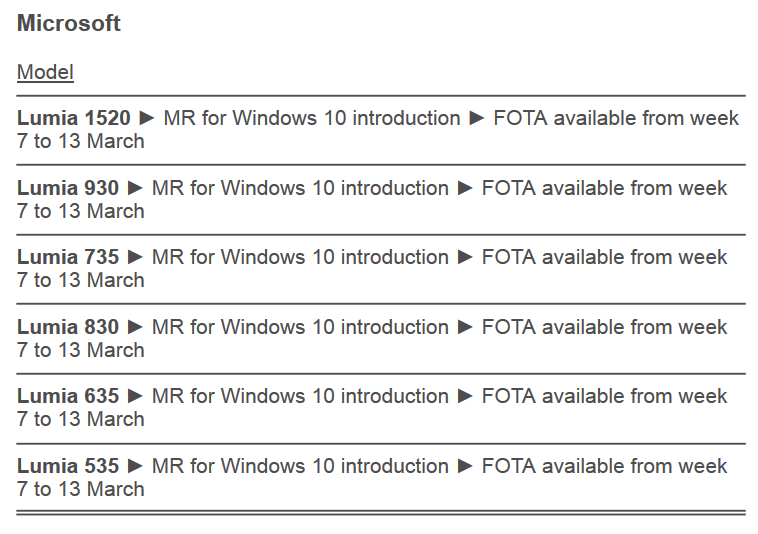 این صفحه خاطر نشان کرده است که این آپدیت فقط برای گوشی های تحت اپراتور VodaFone در ایتالیا است ؛ اما حاکی از این دارد که به زودی این آپدیت در کشور هایی مانند آمریکا نیز عرضه خواهد شد. طبق این پست اولین مدل هایی که این آپدیت را دریافت خواهد کرد بدین ترتیب است: مایکروسافت لومیا 535، نوکیا لومیا 635، نوکیا لومیا 735، نوکیا لومیا 830، نوکیا لومیا 930 و نوکیا لومیا 1520 . این مدل ها از هفتم مارچ در ایتالیا ویندوز 10 موبایل را توسط گوشی دریافت خواهند کرد. مدل هایی که با ویندوز 10 معرفی شدند لومیا 950، لومیا 950XL و لومیا 550 هستند.