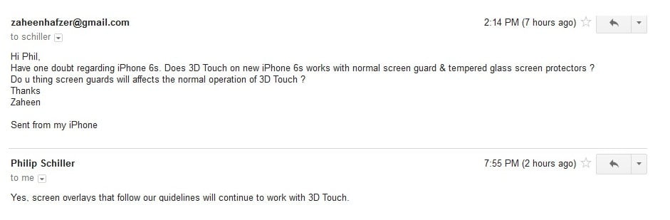 در ایمیل ارسالی به شیلر پرسیده شده که آیا 3D Touch با محافظ های صفحه نمایش به خوبی کار می کند یا وجود آنها عملکرد نرمال این قابلیت را تحت تاثیر قرار می دهد؟ شیلر خوشبختانه پاسخ داده و خیلی خلاصه گفته تا زمانی که محافظ ها از رهنمودهای اپل برای ساخت پیروی کنند، 3D Touch به خوبی کار خواهد کرد. جالب اینکه رهنمودهای کلی اپل برای ساخت لایه محافظ تغییری نکرده و شامل حداکثر ضخامت 0.3 میلی متر، نبود حباب هوا بین محافظ و صفحه لمسی و عدم هدایت الکتریکی محافظ می باشند. این موارد در گذشته هم به همین شکل بودند و در نتیجه کاربران می توانند با خیال راحت محافظ مناسب را روی صفحه نمایش نصب کرده و از سه سطح فشاری لذت ببرند.