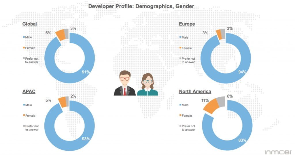 InMobi، طی اقدامی 3 منطقه از جهان را که در حال فعالیت بر روی توسعه ی برنامه های موبایل هستند مورد بررسی قرار داده است. آمریکای شمالی، اروپا و آسیا و اقیانوسیه مناطقی هستند که InMobi آن ها را بررسی کرده است. در سطح جهانی، مرد ها در این صنعت کاملا جا افتاده هستند و 91 در صد از برنامه نویسان بررسی شده آقا هستند. در مناطق اروپا و آسیا و اقیانوسیه تنها 5 در صد از توسعه دهندگان اپلیکیشن های گوشی های همراه خانم هستند در حالی که در آمریکای شمالی حدود 11 در صد از برنامه نویسان خانم بوده اند.