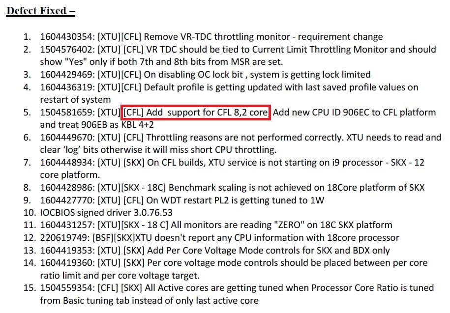 چندی پیش اطلاعاتی از تراشه Z390 را برای شما عزیزان منتشر کردیم که نشان می داد این چیپست در کنار پردازنده های 8 هسته ای Ice Lake در سال 2018 راهی بازار خواهند شد. در همین حال یک اسلاید از لیست XTU منتشر شده است که نشان می دهد احتمالا اینتل در پردازنده های 8 هسته ای خود نیز از همان معماری Coffee Lake استفاده خواهد کرد. در کنار پشتیبانی از پردازنده های 8 و 2 هسته ای، واژه ی CFL درج شده است که احتمالا به معنی Coffee Lake است.