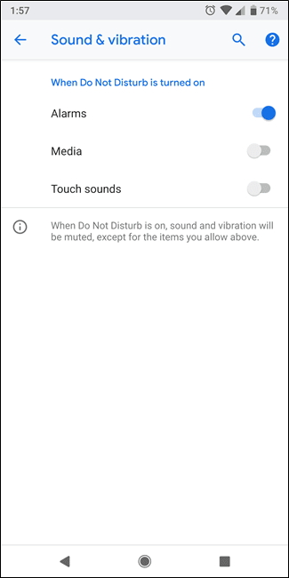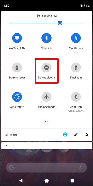 از سوی دیگر در مواردی که کاربران گوشی خود را در وضعیت Silent قرار می دهند ممکن است زنگ هشدار را از دست دهند. در چنین شرایطی نیز تنظیماتی طراحی شده است تا کاربران Alarm گوشی را در چنین مواردی از دست ندهند. برای دسترسی به تنظیمات کافی است تا نوار نوتیفیکیشن را به پایین بکشید و بر روی گزینه ی Do not disturb به مدت چند ثانیه کلیک کنید تا تنظیمات مورد نظر باز شود.