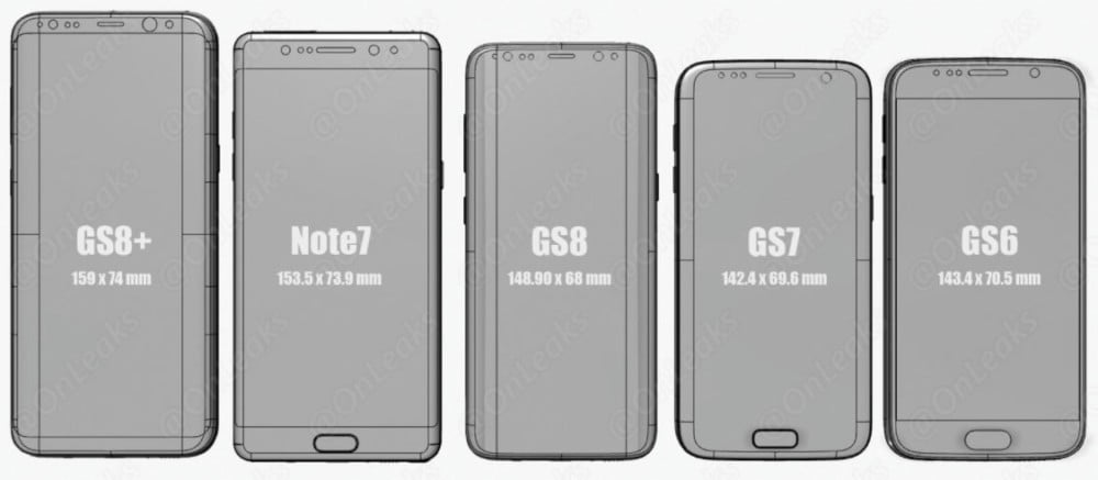 همان طور که در تصاویر میبینید، گلکسی اس 8 در مقایسه با گلکسی اس 7 عرض کمتر و طول بیشتری دارد و این در حالیست که گلکسی اس 7 از نمایشگر 5.1 اینچی و گلکسی اس 8 احتمالا از نمایشگر 5.8 اینچی برخوردار خواهد بود. این اتفاق به واسطه ی تفاوت در نسبت نمایشگر بین این دو گوشی صورت گرفته است که باعث شده گلکسی اس 8 دستگاه دراز تری نسبت به نسل قبل خود باشد. در سمت دیگر گلکسی اس 8 پلاس کم و بیش ابعادی مشابه گلکسی نوت 7 دارد اما 5.5 میلی متر بلند تر است. از آنجا که اس 8 پلاس ممکن است به نمایشگر 6.2 اینچی مجهز باشد، این تفاوت اندازه چندان چشمگیر نیست.