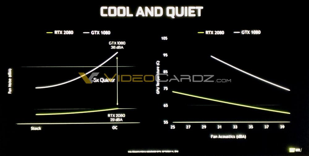 به طور حتم دیده اید که در کارت گرافیک های RTX Founders Edition، از 2 عدد فن استفاده شده است؛ این مسئله با توجه به افزایش توان، عملکرد و ویژگی اورکلاک در این محصولات است تا ضمن تهویه بهبود یافته در زمان اورکلاک، نویز صوتی کمتری ایجاد شود. این شرکت تائید کرده است که این خنک کننده جدید افزون سکوت بیشتر تا 5 برابر، می تواند دمای کارت گرافیک را بین 15 الی 20 درجه سانتی گراد کاهش دهد.