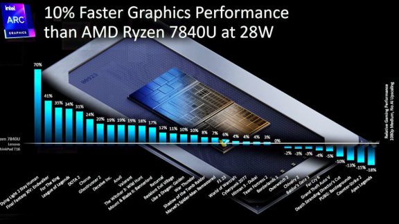 شرکت اینتل قصد دارد روی عملکرد گرافیک Arc تمرکز کند. این شرکت ادعا میکند عملکرد iGPU Core Ultra 7 165H Arc ده درصد سریعتر از گرافیک Ryzen 7840U RDNA3 است....