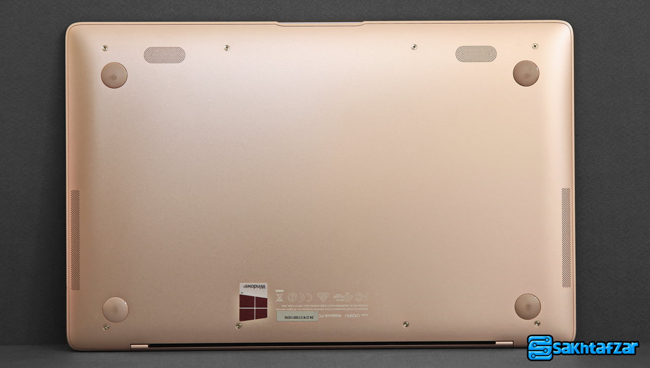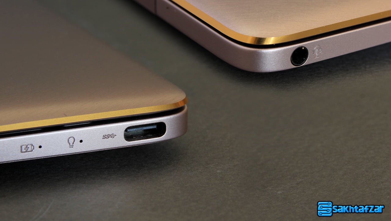 به علت باریک بودن بیش از حد لپ تاپ، ایسوس ترجیح داده است تا یک جک 3.5 میلی متری صدا در سمت چپ محصول و یک پورت USB type-c در سمت راست محصول بگنجاند. پورت USB قرار گرفته به منظور شارژ کردن و اتصال داک موجود در جعبه مورد استفاده قرار می گیرد. این محصول به حدی باریک است که در ضخیم ترین لبه ی خود پورت ها را جای داده است اما باز هم با کمی دقت می بینیم که تنها جک 3.5 میلی متری به اندازه ی کل ضخامت لپ تاپ فضا را اشغال کرده است. ایسوس لبه ی پشتی محصول را به نوشته ZENBOOK SERIES که بروی بدنه حک شده، مزین کرده است.