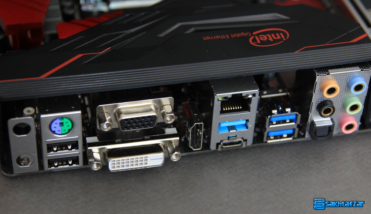 آنسوی مادربرد و در پنل I/O مادربرد، می توان 2 پورت برای قراردادن آنتن شبکه بیسیم،  پورت PS/2 برای اتصال ماوس و کیبورد های قدیمی، تعداد 2 پورت USB برای اتصال لوازم جانبی،  پورت D-Sub، پورتDVI-D ، پورت HDMI، تعداد 3 پورت USB 3.0 از نوع Type-A و یک پورت  Type-C، یک پورت شبکه، تعداد 5 جک 3.5 میلی متری و یک S/PDIF را مشاهده کرد.