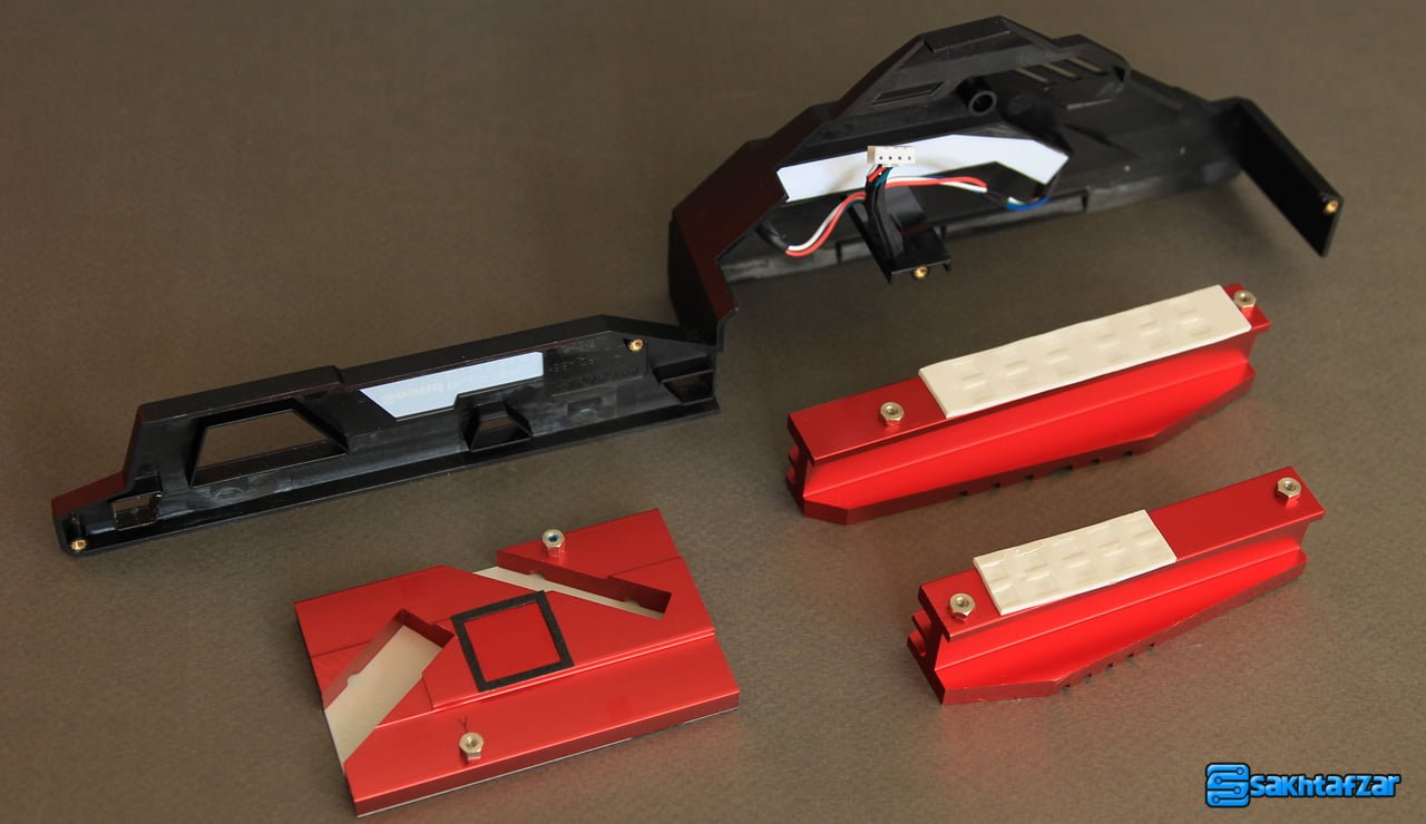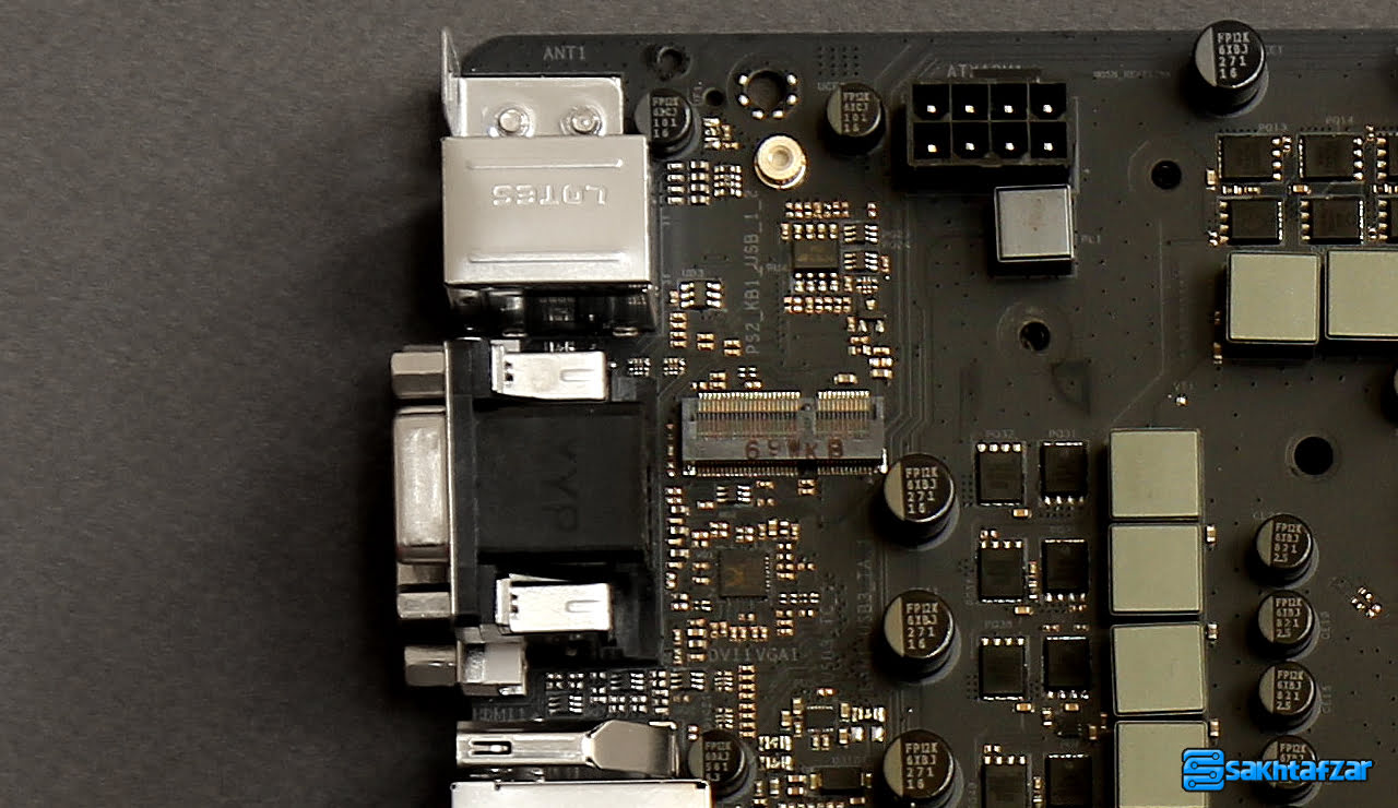 بعد از بررسی ظاهری سینک های دفع حرارت و پنل پلاستیکی قرار گرفته بروی پنل I/O و کارت صدا را باز کردیم. پنل پلاستیک در داخل خود بخشی برای نورپردازی دارد که با کانکتوری به مادربرد متصل شده است. پس از جدا ساختن اتصال سیم پنل به مادربرد، چشممان به یک اسلات M.2 دیگر خورد که بسیار از جایگذاری آن در این مکان شگفت زده شدیم. این پورت برای استفاده از ماژول های بلوتوث یا وای فای مورد استفاده قرار می گیرد که ابعاد پشتیبانی شده آن هم دلیلی است برای این حرف. پنل فلزی هم که برای آنتن قرار گرفته بود صرفاً با استفاده از ماژول وای فای قابل استفاده است.