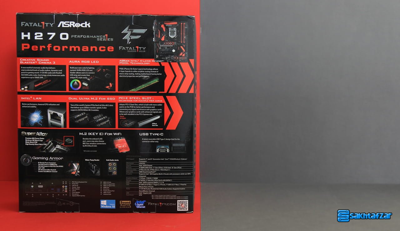 جعبه ای با رنگ زمینه مشکی و حرف G که با رنگ قرمز خود و ابعاد بزرگی که دارد کاملاً جلب توجه می کند. این نوع طراحی به شناخت سریع محصول کمک بسیاری کرده است و به سرعت می توان متوجه شد که با یک مادربرد گیمینگ طرف هستیم. نشان و نوشته FATAL1TY در بالاترین بخش جعبه و نوشته ازراک در زیر آن قرار گرفته است. در وسط جعبه چیپ ست H270 نوشته شده است، نگاه را کمی پایین تر می آوریم و به برچسب گارانتی الماس ایران بر می خوریم که می تواند خیال دوست داران برند ازراک را در بحث خدمات راحت کند. در سمت دیگر می توان ویژگی هایی همچون پشتیبانی از نسل هفتم پردازنده های اینتل، مولتی گرافیک کارت های ای ام دی، و چیپ ست ماربرد را مشاهده کرد.