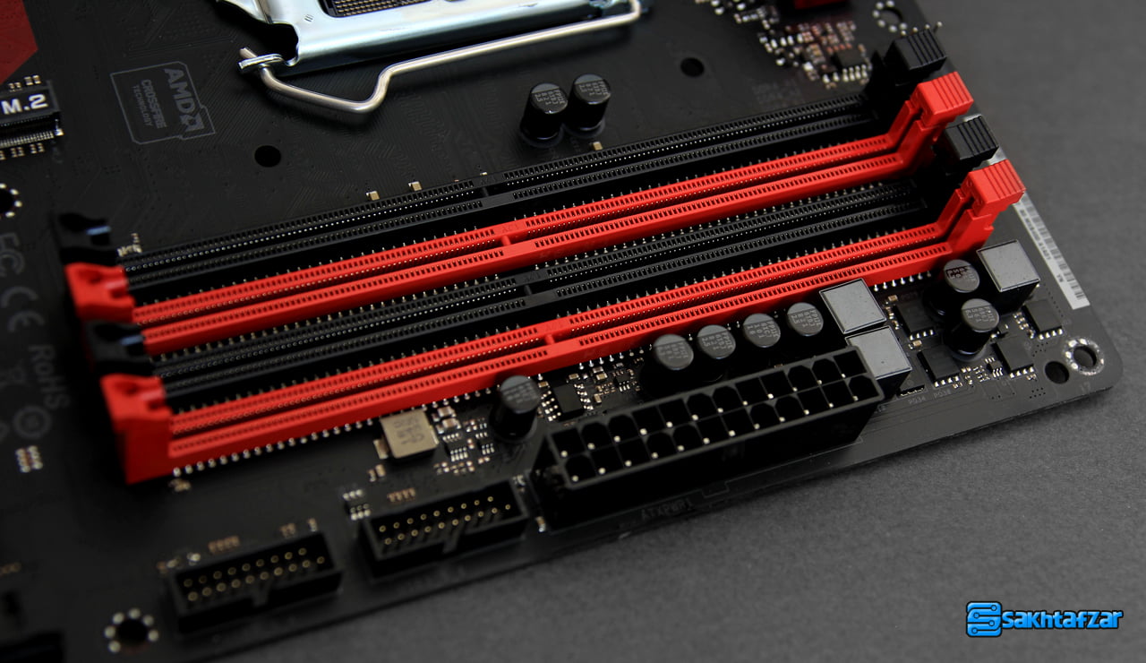 در بخش حافظه شاهد 4 اسلات DIMM هستیم که با رنگ مشکی و قرمز در هماهنگی کاملی با طراحی دیگر اجزای مادربرد به سر می برند. در این بخش کاربر می تواند تا حداکثر 64 گیگابایت حافظه از نوع DDR4 را برای این مادربرد در نظر بگیرد. یکی از نکاتی که در این مادربرد مورد توجه ما قرار گرفت، عنوان نکردن پشتیبانی از حداکثر فرکانس رم بود. چه در جعبه و چه در وب سایت ازراک، تنها حافظه پایه رم درج شده است که در نسل هفتم پردانده های اینتل این فرکانس پایه برابر با 2400 مگاهرتز است و در نسل ششم پردازنده ها برابر با 2133 مگاهرتز است. البته به این معنا نیست که این مادربرد از فرکانس های بالاتر پشتیبانی نمی کند زیرا پشتیبانی از پروفایل XMP نسخه 2 این موضوع را اثبات می کند که می توان از حداکثر فرکانس رم های خود استفاده کنید. البته خوشبختانه زمانی که به تنظیمات بایوس سر زدیم دیدم که فرکانس 3200 مگاهرتز رم های استفاده شده به صورت پروفایل XMP در اختیار ما قرار داشت پس یادتان نرود اگر این مادربرد را تهیه کردید در اولین قدم پروفایل حافظه را بروی حداکثر قرار دهید. ازراک برای ثبات بیشتر حافظه ها از پین های طلایی استفاده کرده است که در کنار استفاده از 4 لایه ساختاری، عملکرد خوبی را از این مادربرد شاهد بویدم.