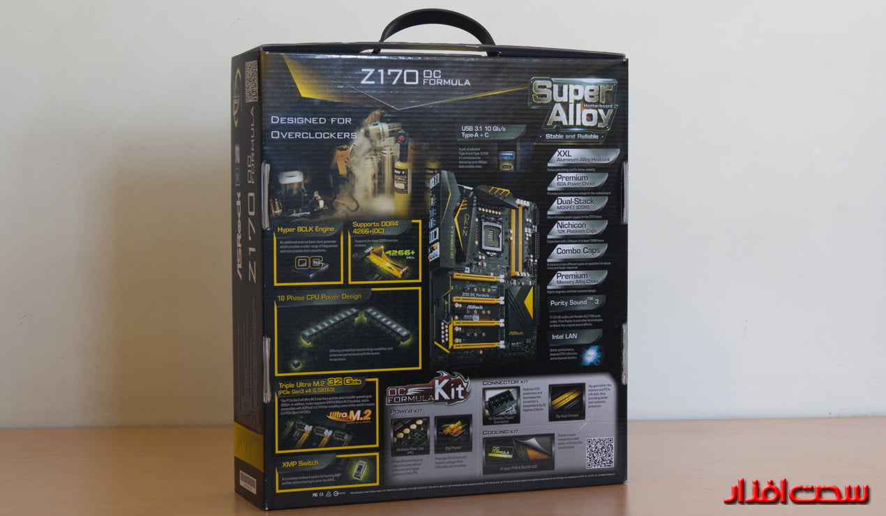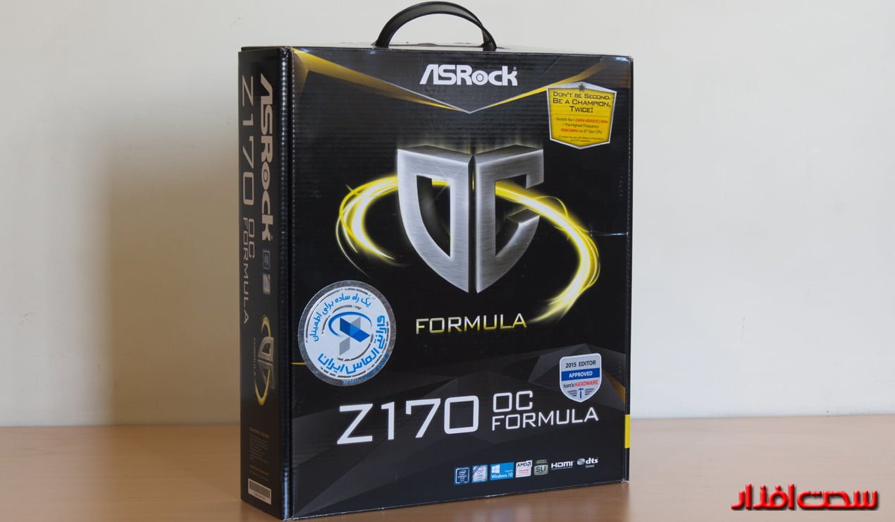 ازراک برای OC Formula جعبه ای مشکی رنگ را در نظر گفته است که بروی آن نشان OC (اورکلاک) و تصویر سازی هایی همانند سینک خنک کننده مادربرد قرار گرفته است. در این بخش همچنین می توان نام محصول، نشان ازراک، پشتیبانی از تکنولوژی DTS، HDMI، مولتی گرافیک انویدیا و AMD، پردازنده های 1151 و دو برچسب که یکی نشان مادربرد برتر از نگاه سایت Tom`s HARDWARE است و دیگری گارانتی الماس ایران است دیده می شود (تصویر 1).