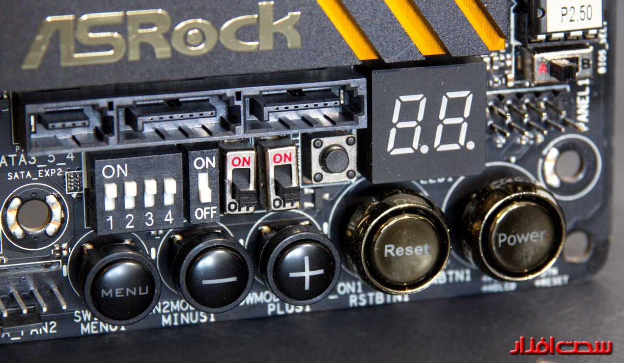 ازراک در OC Formula دکمه های فیزیکی را در نظر گرفته است تا کاربر بی آنکه به محیط بایوس رود، بتواند تغییرات فرکانسی یا سویچ ها را در محیط ویندوز و به وسیله این دکمه ها انجام دهد. در این بخش شاهد پنل سویچ PCIe، سویچ LN2 Mode، سویچ Slow Mode، سویچ پروفایل XMP حافظه، کلید Direct برای وارد کردن UEFI، نمایشگر کدها دیباگر، سویچ بین بایوس ها (استفاده از دو بایوس 128 مگابایتی)، کلید وارد شدن به تنظیمات، کلید کم کردن فرکانس یا تغییرات در تنظیمات، کلید بالا بردن فرکانس یا تغییرات در تنظیمات، کلید ریستارت و کلید روشن/خاموش مادربرد هستیم. در پس این دکمه ها و دیباگر، نور قرمزی میدرخشد که می توان آن را برای همیشه روشن گذاشت یا در تنظیمات بایوس تنها به مدت محدودی آنها را روشن گذاشت. دیباگر مجموعه در کنار نمایش کد ها برای اطلاع رسانی از وضعیت دستگاه، می تواند حرارت پردازنده و بسیاری از اطلاعات دیگر را به کاربر بدهد (تصویر 10).