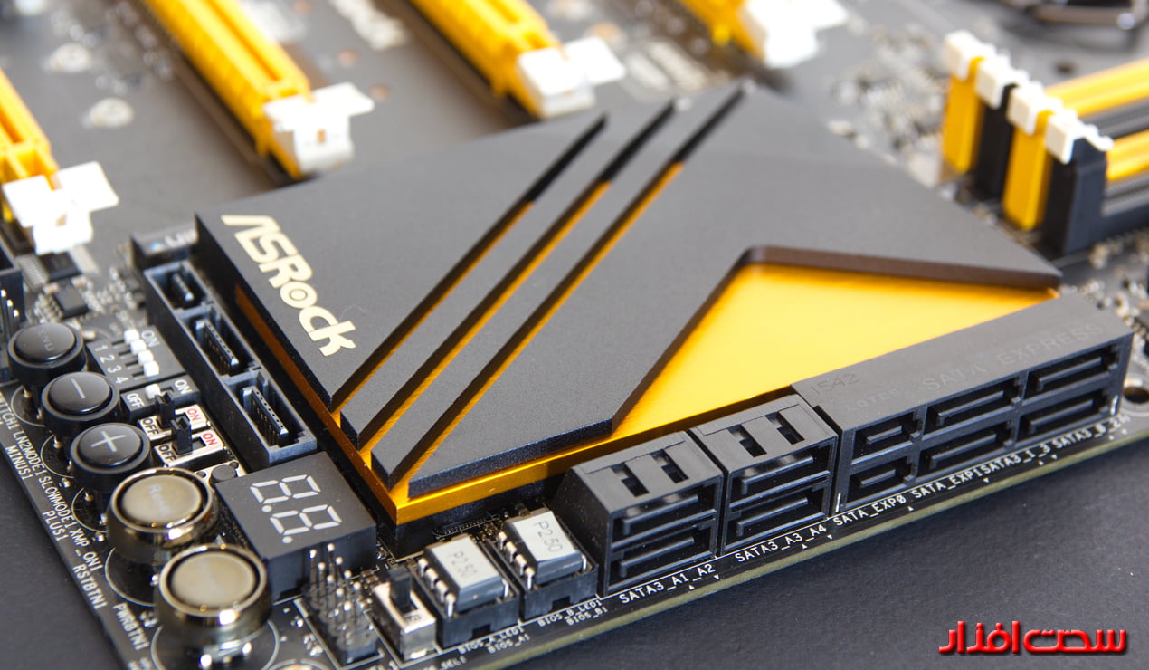 در سمت دیگر مادربرد مجموع 4 پورت ساتا 6 گیگابیت در ثانیه و 3 عدد SATA Express با سرعت 10 گیگابیت در ثانیه که در مجموع می توان به طور همزمان از 10 پورت ساتا در این محصول استفاده کرد. متاسفانه این مادربرد از پورت U.2 محروم است و باید این کیت را جدا تهیه کرد (تصویر 11).
