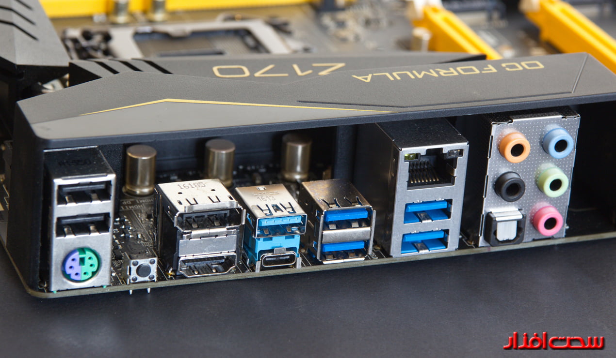 پنل I/O مادربرد دارای پورت PS/2 برای ماوس و کیبورد های قدیمی، دو پورت USB 2.0، دکمه Clear CMOS برای جلوگیری از بروز خطا، یک عدد DisplayPort 1.2 با نهایت رزولوشن 2304×4096 پیکسل ، پورت HDMI، پورت USB 3.1 Type-A، پورت USB 3.1 Type-C، تعداد 4 پورت USB 3.0، پورت LAN، تعداد 5 جک 3.5 میلی متری صدا و پورت اپتیکال صدا یا SPDIF می باشد (تصویر 12).