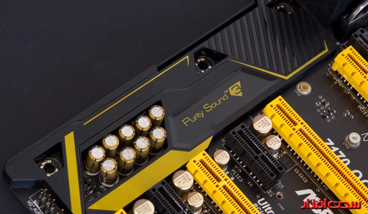 ازراک برای کارت صدای خود نام Purity Sound 3 را انتخاب کرده است. در این کارت صدا شاهد یک مدار خوب همراه با Realtek ALC1150 و کدک های صوتی با کیفیت بالا هستیم. استفاده از خازن های طلایی Nichicon که این روزها در اکثر مادربردهای بروز دیده می شود، برای فیلتر کردن صدا و جدا کردن ناخالصی ها به همراه آکوستیک کردن آن و از بین بردن تداخل در حجم بالا به کار گرفته شده است که می تواند با ایجاد جلوه های صوتی، گزینه مناسبی برای گیمرها و عاشقان موسیقی باشد. صدای تولید شده از این کارت صدا کاملا مناسب است و با وجود 7.1 کانال بودن و ایجاد حداکثر میزان 115 دسیبل دیگر احتیاجی به صرف پول اضافه برای خرید کارت صدای جدا نیست. از ویژگی های این کارت صدا می توان به پشتیبانی از DTS و حمایت از هدفون ها به میزان 600 اهم اشاره کرد (تصویر 13)