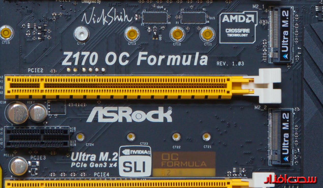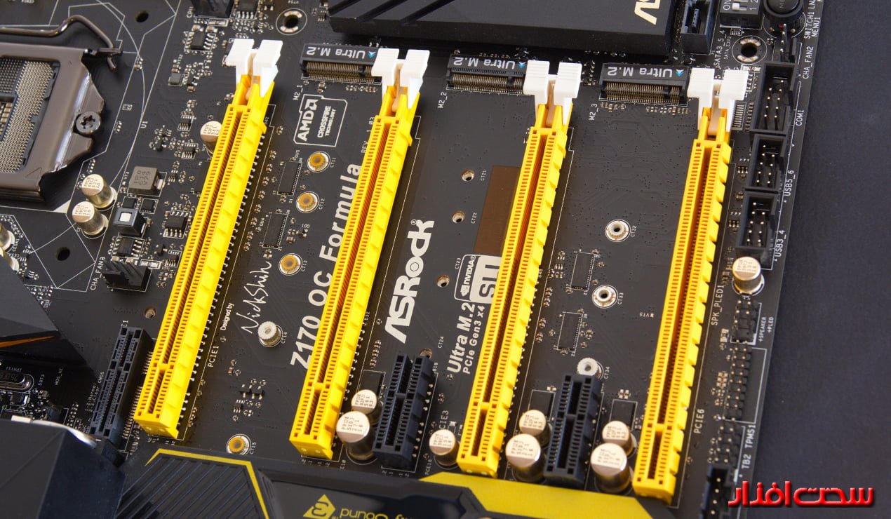 در بخش اسلات های PCIe شاهد 4 اسلات PCI Express x16 هستیم اما تنها یکی از این اسلات ها از نوع x16 است. وجود 4 اسلات PCI Express x16 در ظاهر مانند آن است که کاربر می تواند تا 4 کارت گرافیک را به صورت مولتی گرافیک استفاده کند اما فاصله آنها طوری است که تنها می توان از دو کارت انویدیا جدید بروی مادربرد استفاده کرد. هرچند ازراک عنوان کرده است که برای کاربرانی که از چینش مولتی گرافیک در کارت ها استفاده می کنند، پشتیبانی از SLI کارت های انویدیا با چینش 2Way و CrossFireX کارت های رادئون با چینش 4/3/2 Way قابل استفاده است. در این بین یک اسلات PCI Express 3.0 x1 ، یک اسلات PCI Express 2.0 x1 و یک اسلات Mini-PCI Express برای اتصال قطعاتی مانند کارت صدا و 3 اسلات M.2 برای سرعت بخشیدن به تبادل اطلاعات دیده می شود. البته این نکته را هم یاد آور شویم که با قرار دادن کارت گرافیک به دو اسلات M.2 دسترسی دارید و در چینش مولتی گرافیک به یک اسلات. در این اسلات ها می توان از سالید هایی با طول 42/60/80/110 میلی متری استفاده کنید(تصویر 8).