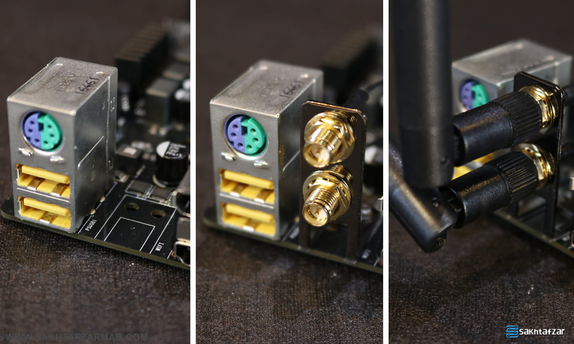 با کمی دقت متوجه فاصله ای بین پورت ها می شوید که با کنجکاوی می توانید دلیل آن را در جعبه مادربرد پیدا کنید. الایت گروپ برای این مادربرد ماژول WiFi را به همراه دو آنتن در نظر گرفته است. ماژول را بروی PCB قرار می دهید و دو پیچ موجود در جعبه را از زیر به ماژول متصل می کنید. بعد از نصب دو آنتن و سیم های سربی می توانید از این مازول استفاده کنید و دیگر پولی را برای خرید دانگل خرج نکنید. این مادربرد همزمان از  Realtek DRAGON LAN Chip 8118AS و INTEL I-219V برای این ارتباط استفاده می کند.