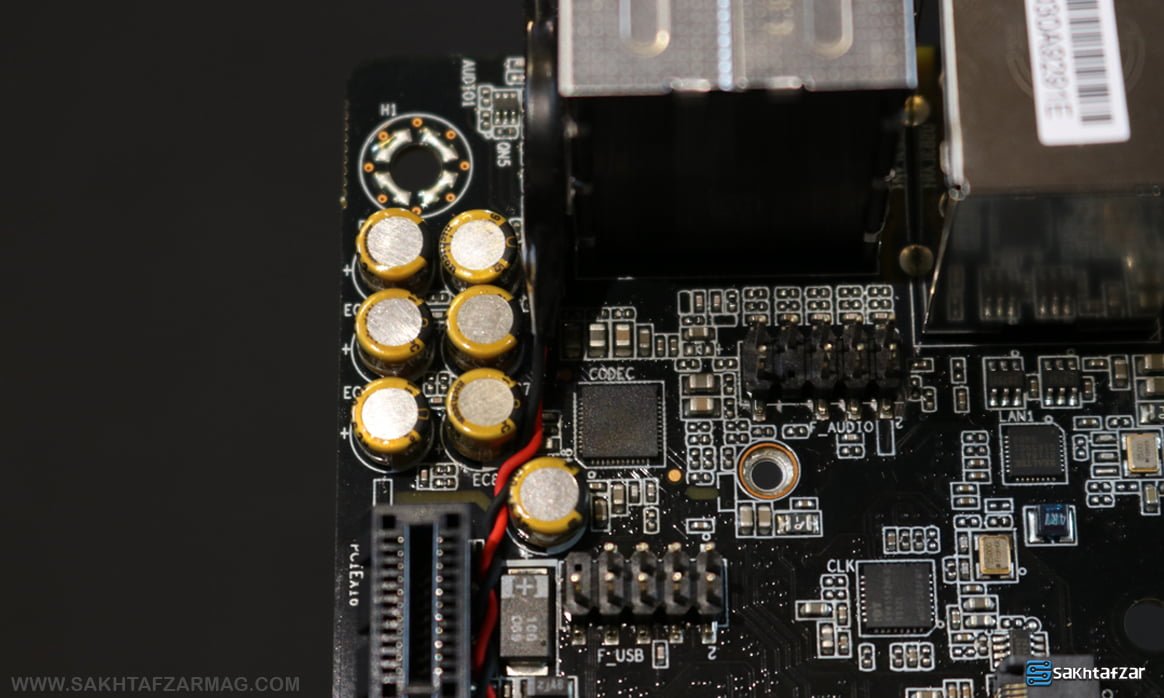 و اما در بخش صدا استفاده از Realtek ALC1150 در کنار استفاده از خازن های طلایی، کیفیت صدای این مادربرد را تضمین کرده است. معمولا ALC1150 با استاندار 7.1 کانال بروی مادربردها قرار می گیرند اما در این مادربرد استفاده از 5.1 کانال کمی محاسبات ما را برهم زده است. از ویژگی های کارت صدای یاد شده می توان به SNR برابر با 110 تا 115 دسیبل، پشتیبانی از کیفیت 16، 20 و 24 بیت، پشتیبانی از فرکانس 44.1k/48k/96k/192kHz و فرکانس خروجی SPDIF برابر با 32k/44.1k/48k/88.2k/96k/192kHz اشاره کرد.