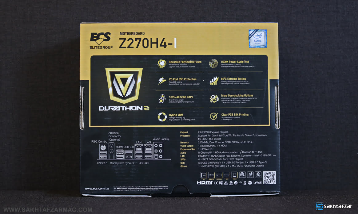 پشت جعبه کاملا بازگو کننده ویژگی های محصول است. در این بخش نشان شرکت، پشتیبانی از پردازنده های اینتل، نام محصول، توضیحاتی در مورد ویژگی DURATHON، استفاده از قطعات با کیفیت، نمایش پنل I/O مادربرد و مختصری از مشخصات محصول را می توان مشاهده کرد.