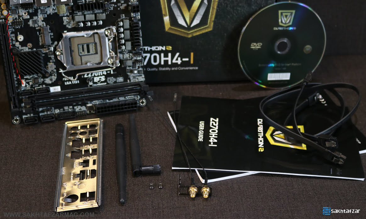 داخل جعبه Z270H4-I مواردی همچون براکت I/O، سی دی درایور، دفترچه راهنما، تعداد 2 کابل ساتا، ماژول WiFi، دو آنتن و 2 پیچ برای نصی ماژول بروی PCB قرار گرفته است.