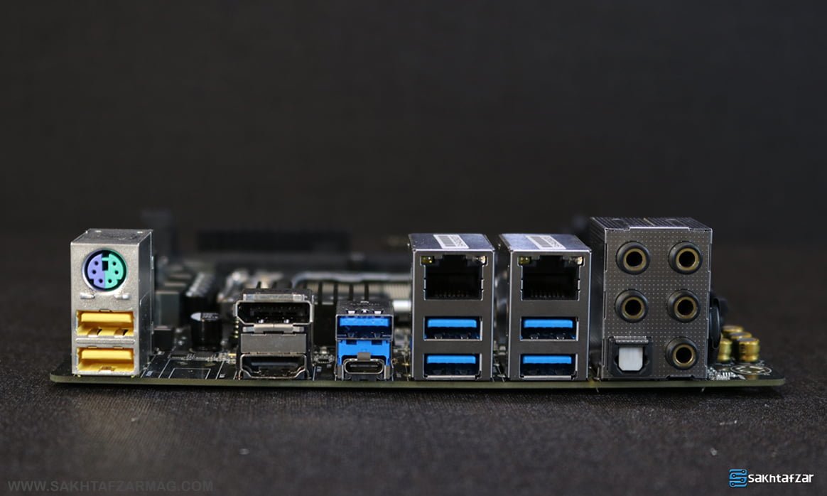در بخش پنل I/O شاهد پورت PS/2 برای ماوس و کیبوردهای قدیمی، تعداد 2 پورت USB 2.0، یک Display Port، یک پورت HDMI، تعداد 5 پورت USB 3.0 از نوع Type-A، یک پورت USB 3.0 از نوع Type-C، تعداد 2 کانکتور LAN از نوع RJ45، تعداد 5 جک 3.5 میلی متری صدا با روکش طلایی و یک جک  SPDIF هستیم.