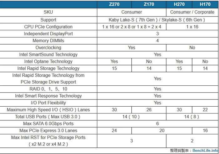 یکی دیگر از امکانات نهفته در چیپست های سری 200 اینتل را می توان به پشتیبانی از تکنولوژی Rapid Storage Technology v15 نسبت داد. مسیرهای قدیمی و با سرعت کمتر که عموما در اختیار رابط های USB 3.1 و M.2 قرار می گیرند، شامل مدل های PCIe X1 می شوند که گاها به صورت تکی و یا ترکیبی استفاده می شوند. در چیپست های سری 200 پشتیبانی از این مسیرها به 30 عدد رسیده است که در پلتفرم پیشین برابر با 26 عدد بوده است. آنچه که چیپست Z270 را از H270 جدا می سازد، همان چیزی است که دو چیپست Z170 و H170 را از یکدیگر متمایز می کند. به عنوان مثال می توان به قابلیت اورکلاک در چیپست Z270 اشاره کرد که چیپست H270 فاقد آن خواهد بود. مورد دیگر قابلیت ترکیب و ادغام مسیر های HSIO در زمینه PCIe است که چیپست H170 فاقد این ویژگی است. بدین ترتیب که چیپست Z270 می تواند مسیرهای PCIe 3.0 X16 را به دو مسیر X8 تبدیل سازد که این قابلیت در پشتیبانی از فناوری Multi GPU مورد استفاده قرار می گیرد. هر چند که این محدودیت تنها به کارت گرافیک های Nvidia ختم می گردد و کارت گرافیک های AMD تا حدودی با این مسئله کنار آمده اند چرا که کارت گرافیک دوم مسیر PCIe X4 را در اختیار می گیرد و متاسفانه نتیجه ی خروجی نیز در این چیشنش اصلاً رضایت بخش نیست.