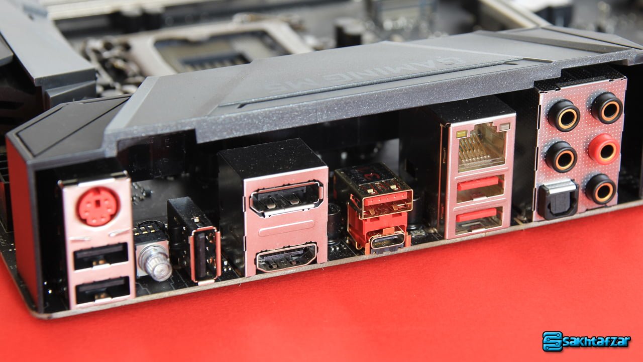 آنسوی مادربرد و در پنل I/O مادربرد، می توان پورت PS/2 برای اتصال ماوس و کیبورد های قدیمی، تعداد 2 پورت USB برای اتصال لوازم جانبی،  کلید Clear CMOS برای رفع مشکلات، یک پورت USB برای فلش بک بایوس، پورت Display، پورت HDMI، دو پورت USB 3.1 از نوع Type-A و Type-C، یک پورت شبکه، دو پورت USB قرمز رنگ با پشتیبانی از تکنولوژی VR، تعداد 5 جک 3.5 میلی متری و یک S/PDIF را مشاهده کرد.