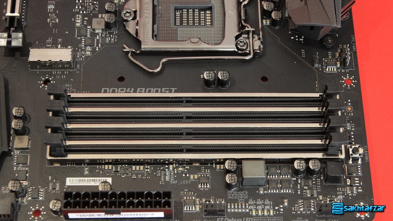 در بخش حافظه شاهد 4 اسلات DIMM هستیم که همچنان با رنگ مشکی در گوشه ای خودنمایی می کند. در این بخش کاربر می تواند تا حداکثر 64 گیگابایت حافظه از نوع DDR4 را برای این مادربرد در نظر بگیرد. استفاده از زره فلزی برای اسلات ها یکی از مواردی است که در کنار زیبایی باعث وجود استحکام و طول عمر این بخش از مادربرد شده است. یکی از موارد دیگر که از دیدن آن خوشحال شدیم استفاده از قفل های متحرک در دو سمت اسلات ها بود. در بسیاری از موارد که از زمان چیپ ست های Z170 مد شده بود، شاهد آن بودیم که تنها یک سمت از اسلات DIMM مجهز به قفل متحرک بود و سمت دیگر ثابت طراحی شده بود. در این مادربرد شما می توانید همچون گذشته با سرعت بالا حافظه رم را جابجا کنید (البته برای ما که قطعات را برای بررسی مدام عوض می کنیم جذابتر است). حداکثر فرکانس کاری در این مادربرد در حالت اورکلاک به 3800 مگاهرتز هم می رسد که بهتر از گذشته است. هر چند پیدا کردن حافظه هایی با فرکانس بالاتر از 3400 مگاهرتز در بازار مشکل است و حتی اگر به راحتی هم پیدا شود نمی توان با زمان تاخیر بالایی که دارند کنار آمد پس ترجیح می دهیم رم ها را اورکلاک کینم.