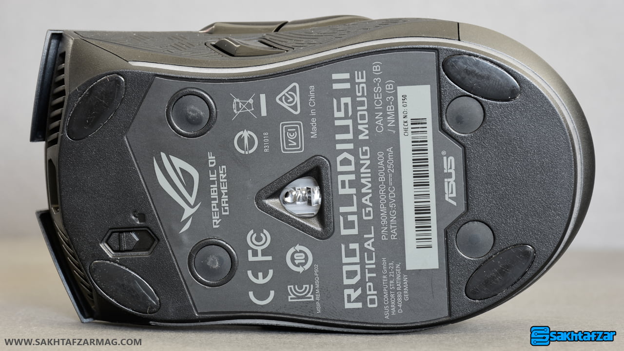 در زیر ماوس 4 قطعه پلاستیکی گرد قرار گرفته است که با برداشتن آنها می توانید به 4 پیچ دسترسی داشته باشید. با باز کردن پیچ ها قاب روی ماوس برداشته می شود و می توان به سویچ های کلیک و اجزاء داخلی دسترسی داشت. یکی از ویژگی های بارز گلادیوس 2 وجود 2 سویچ دیگر در جعبه این ماوس است. هر کدام از سویچ های ژاپنی OLRON می تواند تا 50 میلیون کلیک طول عمر داشته باشد. چنانچه بعد از مدتها کار کردن با ماوس احساس کردید کلیک کردن با دقت بالایی انجام نمی شود می توان با قرار دادن سویچ های موجود این مشکل را برطرف کرد.