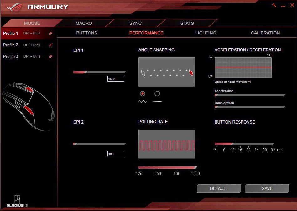 بعد از تهیه این ماوس به وب سایت ایسوس مراجعه کرده و نرم افزار اختصاصی موجود را برای این محصول دانلود کنید. نرم افزار ROG ARMOURY نرم افزاری است کامل که دسترسی گسترده ای را برای کاربر به وجود می آورد. این نرم افزار قابلیت این را دارد تا 3 پروفایل را برای کاربر در نظر بگیرد و کاربر هم می تواند در هر کدام از پروفایل ها شخصی سازی هایی همچون نورپردازی، تغییر دستور کلید ها و حساسیت DPI را تغییر دهد.