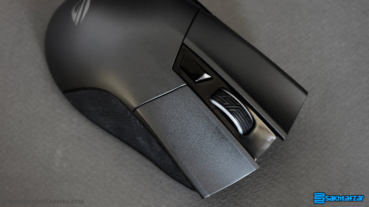 در طراحی گلادیوس 2 به بسیاری از فاکتورها توجه شده است تا حس در دست بودن ماوس در ذهن کاربر تقویت شود. از دکمه ها شروع می کنیم. دکمه هایی که برای کلیک کردن در نظر گرفته شده اند، به گفته ی ایسوس برای یک عملکرد دقیق و خوب طراحی شده اند، اما در واقعیت هم این چنین است؟ دکمه های کلیک راست و کلیک چپ را اگر به دقت مشاهده کنید متوجه می شوید که نقطه اتصال آنها به بدنه متفاوت شراحی شده است. در اعمال کلیک چپ انگشت کاربر محیط گردش بیشتری را می تواند انجام دهد اما انگشتی که با آن کلیک راست را انجام می دهید چندان موقعیت خود را برای کلیک کردن تغییر نمی دهد. به طور مثال ممکن است یک بار از قسمت بالای دکمه کلیک چپ را انجام دهید، یک بار از مرکز دکمه و یک بار هم از پایین دکمه کلیک کنید اما برای کلیک راست کردن کمتر پیش می آید که انگشت تغییر گسترده ای را در محل کلیک کردن داشته باشد. مورد دیگر عمق مناسب کلید ها است به طوری که این عمق شما را مجاب می کند تا از مکان مورد نظر اقدام به کلیک کردن کنید که همین مورد دقت در کلیک را بالا می برد. غلطک اسکرول هم از ساختار خوبی برخوردار است و برای استحکاک بیشتر با پوششی از پلاستیک نرم در گلادیوس قرار گرفته است. دکمه دیگری که در این بخش قرار گرفته است برای سویچ کردن DPI در نظر گرفته شده است. دقت DPI را می توانید با استفاده از نرم افزار ارائه شده کم یا زیاد کنید اما متاسفانه این سویچ تنها با 2 مرحله کاربر را همراهی می کند که بهتر بود حداقل این سویچ کردن با 3 یا 4 مرحله مختلف انجام می شد.
