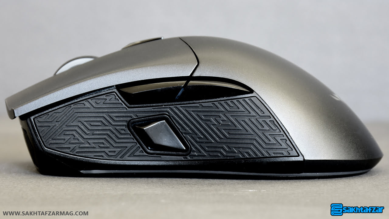 قوس کمر ماوس برای قرار گیری کف دست مناسب است و با ساختاری که دارد می تواند دست کاربر را کاملاً پوشش دهد. البته سطح این بخش از ماوس استحکاک کمی را ایجاد می کند و ممکن است با خود بگویید که هنگام جابجا کردن، ماوس از دست خارج می شود اما ایسوس برای استحکاک و چسبندگی بیشتر، لبه های ماوس را با ساختاری متفاوت در نظر گرفته است. در لبه ها، گلادیوس به پلاستیک نرم و نقش داری مجهز شده است که باعث جابجایی بهتر محصول می شود.