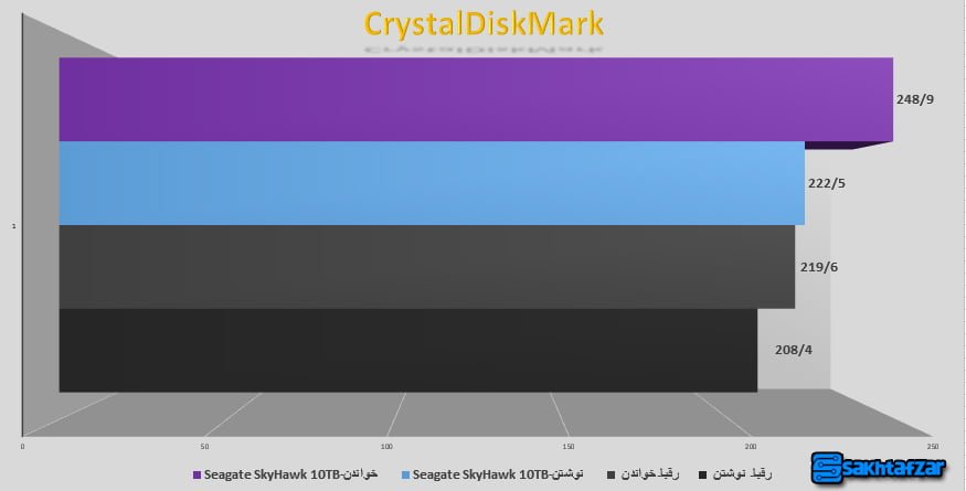 سیگیت در بخش هارددیسک های جدید خود 3 رده از محصولات را با وسواس بسیار تولید کرده است. رده هایی همچون BARRACUDA برای مصارف محاسباتی، IRONWOLF برای عملکرد های طولانی مدت و SKYHAWK برای سیستم های نظارتی توید شده اند. تمام سری های ذکر شده با ظرفیت هایی تا 10 ترابایت در نظر گرفته شده اند. هارد مورد بررسی ما از سری SKYHAWK با ظرفیت 10 ترابایت و سرعت 7200 دور در دقیقه بود. این هارد دیسک با ساختاری هوشمند و عملکردی امن می تواند تا 10 هزار ساعت فیلم دیجیتال را با کیفیتی بالا در خود ذخیره کند. پشتیبانی از 8 درایو و 64 دوربین از ویژگی های بارز این محصول است. یکی دیگر از مزیت های این هارد دیسک را می توان به مصرف انرژی پایین آن نسبت داد به طوری که در حالت بار کامل 6.8 وات و در حالت بیکاری تنها 0.8 وات مصرف انرژی را به خود اختصاص می دهد. سیگیت میانگین سرعت انتقال داده این محصول را 210 مگابایت در ثانیه اعلام کرده است که در تست های انجام شده به راحتی توانستیم به این عدد دست یابیم. برای استفاده از سیستم های نظارتی انتقال داده بیش از 200 مگابایت در ثانیه را می توان بسیار مناسب ارزیابی کرد. این عدد در بالاترین سطح خود به 280 مگابایت در ثانیه هم رسید اما این مقدار عددی ثابت نیست.