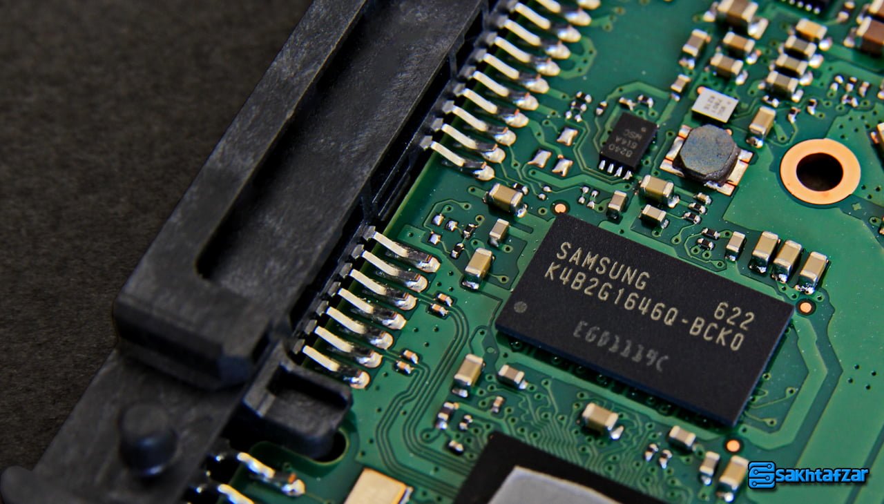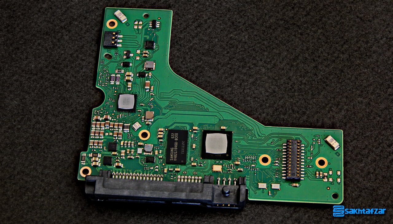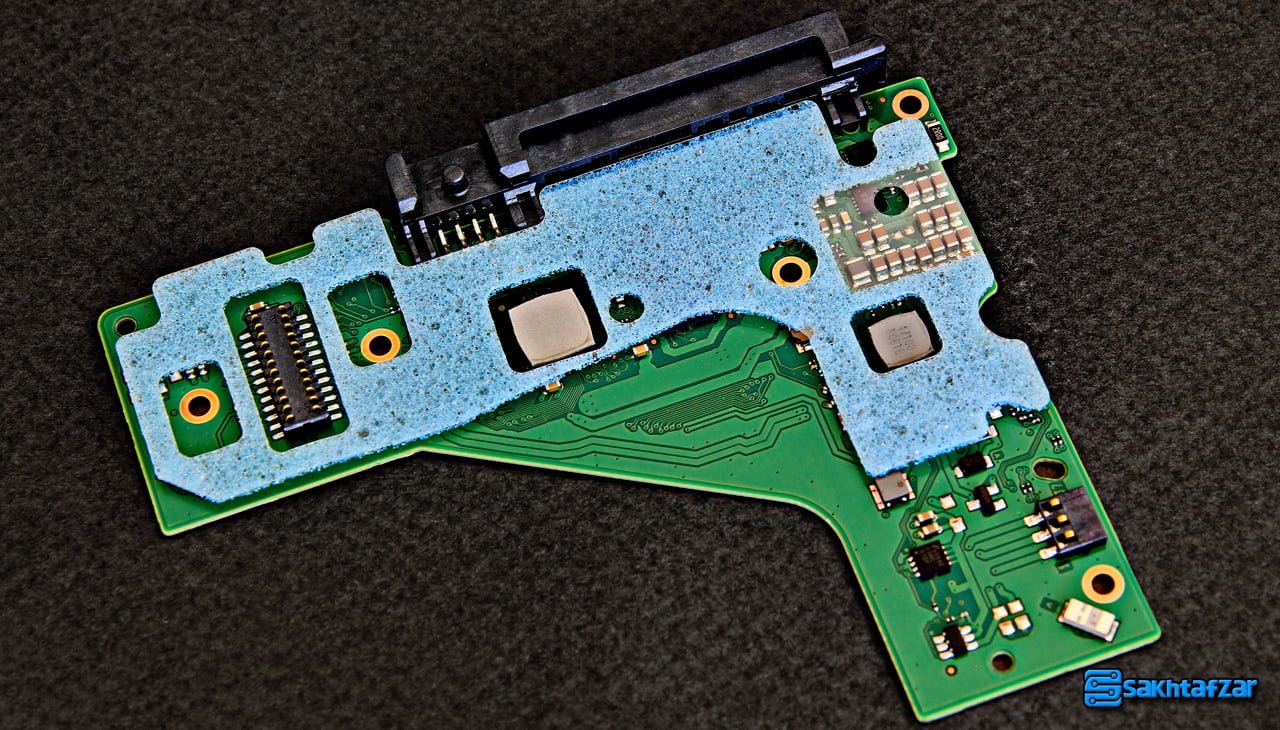 با برداشتن پوشش اسفنجی می توان قطعات استفاده شده در بورد را هر چه شفاف تر بررسی کرد. در این بخش یک سوکت 3 پین برای اتصال به کابلی نارنجی رنگ که در مرکز هارد قرار گرفته است، یک سوکت 24 پین برای اتصال به اسلاتی که در گوشه هارد قرار گرفته است و حافظه ای از تولیدی های شرکت سامسونگ، بیشترین نمود را دارند.
