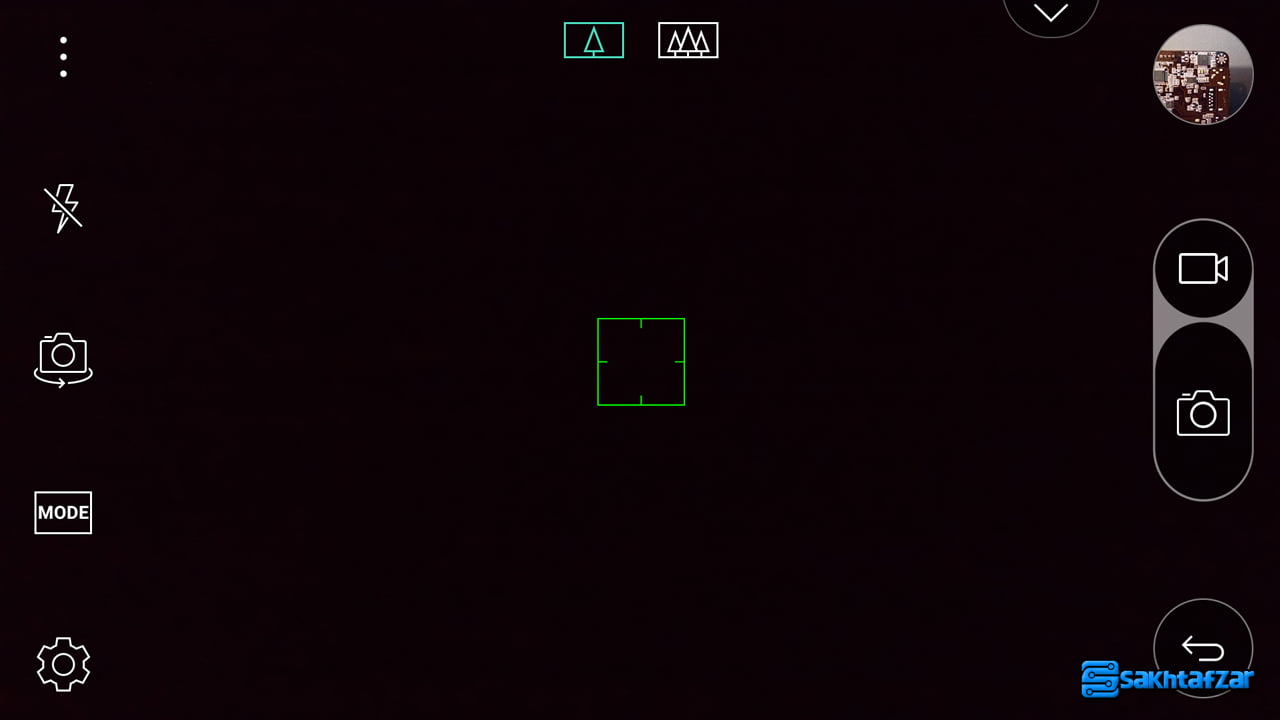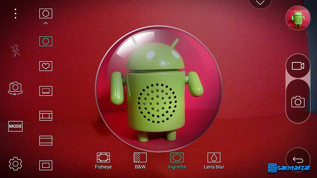 در این رابط کاربری در سمت راست گزینه هایی مانند تماشای عکس های گرفته شده، فیلم برداری، عکس برداری و خروج از محیط دوربین را دارید. در بالا یک نوار قرار گرفته است که با پایین کشیدن آن می توانید نرم افزارهای مورد نظر خود را برای به اشتراک گذاشتن تصاویر ثبت شده داشته باشید، دو نماد که با یکی با تک درخت و دیگری با سه درخت نمایش داده می شود برای زاویه 75 درجه یا 120 درجه کاربرد دارد. در سمت چپ می توانید گزینه هایی مانند عملکرد فلاش، تعویض جهت دوربین، مود هایی مانند حالت خودکار-popout- پانوراما و تنظیمات اصلی را مشاهده کنید. متاسفانه در نرم افزار دوربین خبری از تنظیمات دستی برای عکسبرداری نیست و کاربر تنها می تواند از حالت خودکار برای ثبت تصاویر خود استفاده کند.