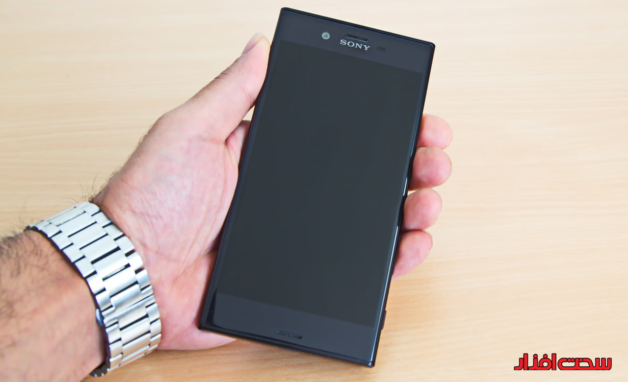 XPERIA XZ با ابعاد 8.1×72×146 میلی متری که دارد به خوبی در دست قرار می گیرد اما وزن 161 گرمی آن نسبت به ابعاد آن کمی زیاد به نظر می رسد. این گوشی از نظر وزن کمی بیشتر از دو رقیب کره ای یعنی S7 و G5 است اما با HTC10 کاملاً برابری می کند. در نمای روبروی این محصول می توان صفحه نمایش 5.2 اینچ، اسپیکر مکالمه (که نقش اسپسکر استریو را هم بازی می کند)، دوربین ثانویه، سنسورهای مجاورت و نشان سونی را مشاهده کرد. در این نما به دلیل انحنای کمی که در حاشیه های چپ و راست وجود دارد، ظاهر گوشی را جذاب کرده است و از حالت جعبه بودن خارج کرده اما همچنان حاشیه بالا و پایین صفحه نمایش بسیار زیاد است، آن هم در دورانی که شرکت ها به فکر کم کردن یا حذف این حاشیه ها هستند (تصویر۴).