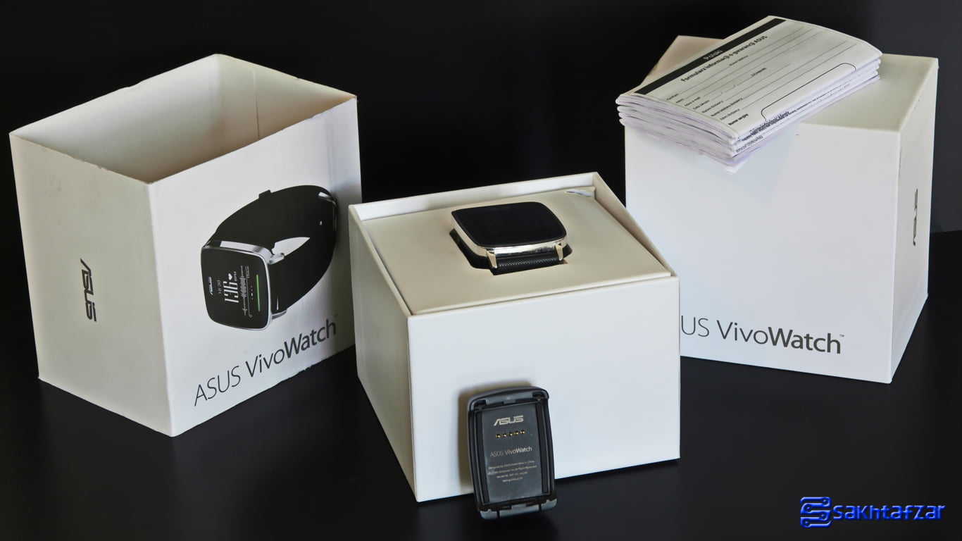 با جدا کردن پوشش روی جعبه، با جعبه اصلی محصول روبرو می شوید که پس از باز کردن آن می توان دستبند سلامت، داک شارژ، کابل Micro USB (در جعبه ارسالی از سمت ایسوس نبود) و دفتر چه راهنما را مشاهده کرد.