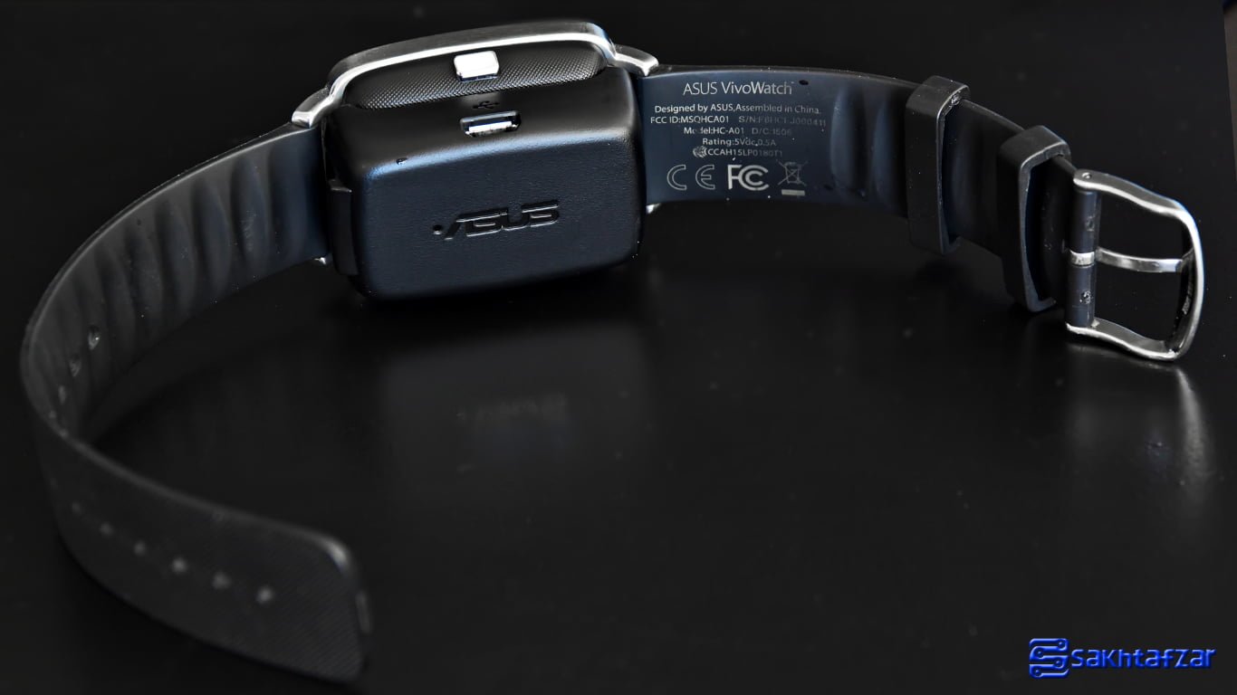 قاب پشت این محصول از جنس پلاستیک و با طراحی مانند نمای روی بند ها شکل گرفته است. در این نما، قاب موجود با 4 پیچ به بدنه متصل شده است که ممکن است در ذهن کاربر همانند یک ساعت معمولی جلوه کند. اما پنل 5 پین طلایی برای اتصال داک شارژ و سنسور های سلامت، این ذهنیت را کمی دور خواد کرد. در لبه راست VivoWatch دکمه ای قرار گرفته است که می توان با آن فعالیت دستبند را کنترل کرد.
