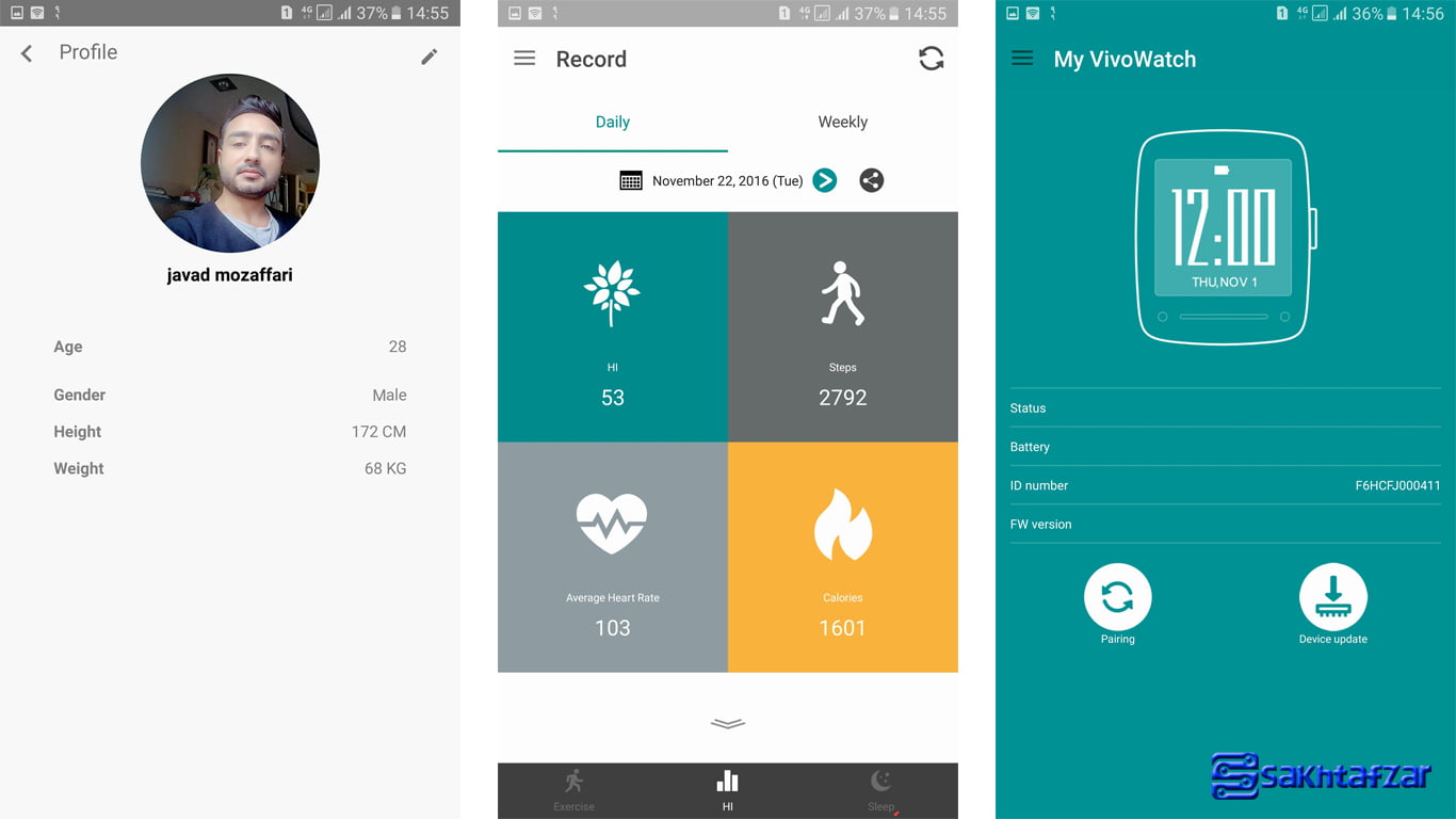 قبل از هر مورد بگوییم که این محصول با سیستم عامل اندروید و iOS همگام سازی می شود پس خیالتان از این بابت راحت باشد. برای همگام سازی با گوشی های اندرویدی می توانید از مارکت ها نرم افزار HiVivo را دانلود کرده و ساعت را با آن همگام سازید. قبل از هرموردی باید مشخصات خود را که شامل نام، تاریخ تولد، قد و وزن هست را قرار دهید. بعد از آن نرم افزار با ساعت شروع به همگام سازی می کنند تا داده ها بروی تلفن هوشمند شما نمایش داده شود.