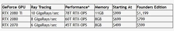 بر خلاف AMD که در هنگام معرفی محصولات جدید، سخت افزارهای خود را با مدل های رقیب مقایسه کرده و بنچمارکهای آزمایشگاهی خود را ارائه می کند، انویدیا تنها به مقایسه کارت گرافیک های Turing با نسل های پیشین خود پرداخت. Jensen Huang گفت: این معماری و کارت گرافیک های NVIDIA GeForce RTX 20، در 10 سال گذشته، برترین معماری این شرکت هستند. فاصله پرفورمنس کارت گرافیک های تورینگ با پاسکال، بسیار بیشتر از مدل های پاسکال با مکسول است. امکان اجرای بسیار ساده بازی های 4K در فرکانس های 60 هرتز نیز برای این محصولات تضمین شده است.