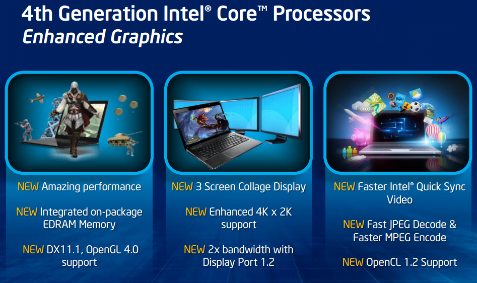 بخش اجرای دسکتاپ و برنامه های سبک را بر عهده گرافیک های IGP قرار داده و بازی و یا برنامه های سنگین تر با گرافیک های مجزا رندر می شدند. از سوی دیگر در کامپیوترهای دسکتاپ نیز بسیاری از کاربران که نیازی به یک کارت گرافیک توانمند و مجزا نداشتند، با صرفه جویی در هزینه های خود، از گرافیک داخلی CPUهای اینتل استفاده کردند. امروزه گرافیک های مجتمع اینتل موفق به پیمایش راه سنگین تجربه و فناوری شده و موارد استفاده آنها از گوشی های هوشمند، تبلت، لپ تاپ و مینی کامپیوترها گرفته تا کامپیوترهای سرور، ادامه دارد.