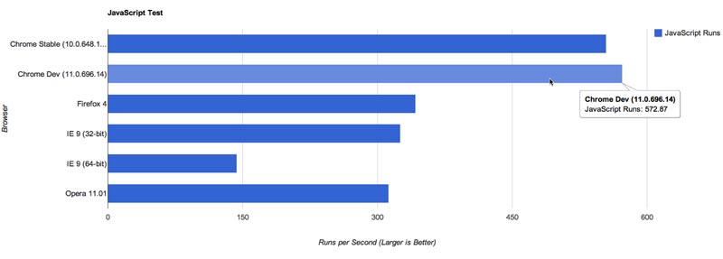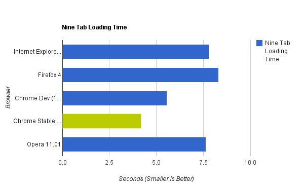 در اين تست برندگان اصلي Chrome 11 و Opera 11 بودند و فايرفاکس در رتبه بعدي قرار ميگيرد. رنگ آبی مربوط به حالتی است که مرورگر با یک سربرگ باز و رنگ قرمز مربوط به حالتی است که مرورگر با نه سربرگ باز اجرا شدهاست.