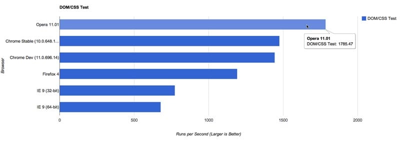 DOM و CSS در اجرای نرمافزارهای تحت وب و دیگر سایتهای وب 2 اهمیت بسیاری دارند. برنده مطلق این تست Opera 11 و بازنده مطلق آن IE 9 بود. در این آزمون نیز نسخه 64 بیتی IE ضعیفتر از نسخه 32 بیتی عمل کرد.