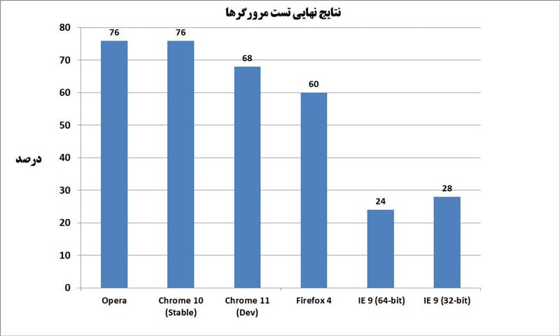 تصوير مندرج در پايين جمعبندي نتايج بدست آمده از تست مرورگرها است. در اين نمودار به طور واضح برتري مروگر اپرا و کروم مشخص است و بعد از آن مرورگر فايرفاکس قرار دارد.
