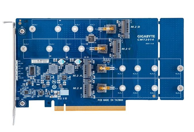 تا پیش از این، ازراک و ایسوس اقدام به معرفی کارت های توسعه جهت نصب درایو های M.2 کرده بودند که البته همراه با خنک کننده اختصاصی و ظاهری مناسب بود. اینک گیگابایت نیز یک کارت مشابه را معرفی کرده است که در آن خبری از خنک کننده اختصاصی و ظاهر مدرن نیست. این محصول با نام GIGABYTE CMT2014 می تواند از 4 اسلات SSD M.2 پشتیبانی نماید.