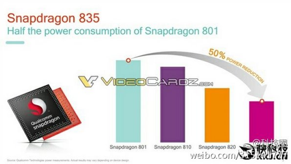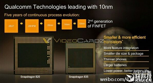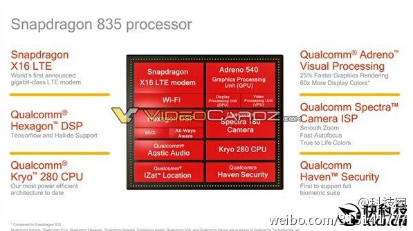 بر اساس اطلاعات موجود در این اسلایدها، اسنپ دراگون 835 همان طور که تصور میشد بر اساس فرآیند 10 نانومتری تولید خواهد شد و عملکرد آن نسبت به اسنپ دراگون 820 به میزان 27 درصد بهبود داشته است. همچنین از نظر میزان مصرف انرژی و ابعاد نیز نسبت به این مدل شاهد بهبودهایی هستیم. همچنین گفته شده است که از مودم های X16 LTE بر روی این SoC ها استفاده شده و SD835 قادر به پشتیبانی از هسته های Kryo 280 می باشد. واحد پردازش گرافیکی Adreno 540 از 60 برابر رنگ بیشتر پشتیبانی می کند که بیشترین میزان در چیپست های تولید شده توسط کوالکام است و سرعت رندر آن نیز 25 درصد افزایش یافته. از نظر ویدئویی نیز پشتیبانی از پخش ویدئوهای 4K با فریم ریت 60fps و در حالت 10 بیتی به همراه گرافیک های Open GL ES، Vulkan و DX12 به این چیپ اضافه شده است.
